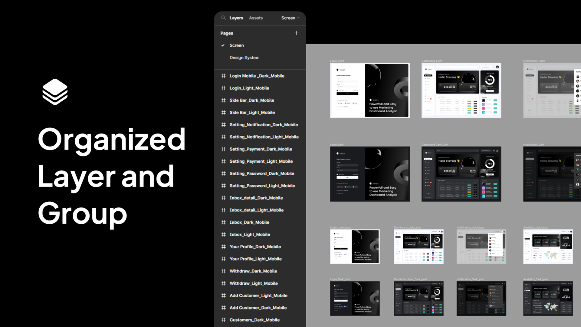 Vision - Marketing Dashboard UI Kit delivers 100+ high-quality screens, a complete design system, and sleek light & dark modes, all designed for seamless customization, full responsiveness, and effortless workflow.